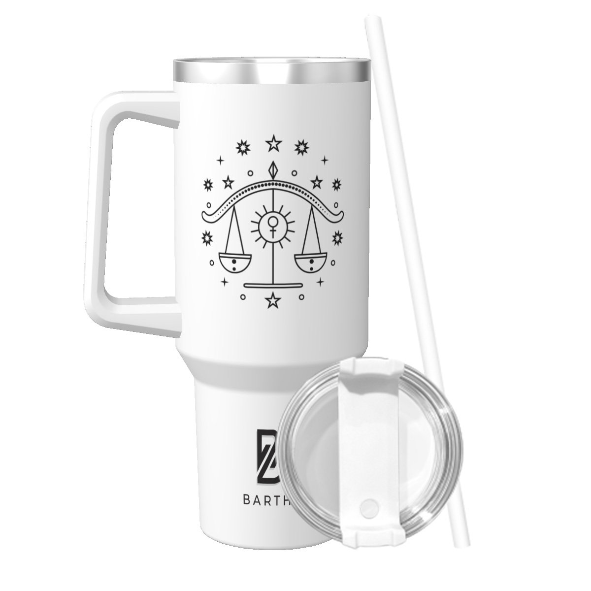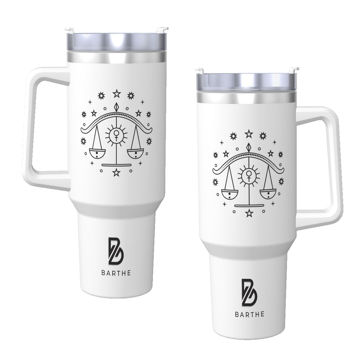 Balance your life with our Libra Zodiac Sign 40oz Tumbler! Featuring an elegant Libra design, this stainless steel tumbler is perfect for astrology lovers and those who embody the harmony and charm of this air sign. With a generous 40oz capacity and double-wall vacuum insulation, it keeps your beverages at the ideal temperature, whether hot or cold. The sturdy handle ensures easy carrying, making it an excellent companion for your adventures or relaxing moments at home.